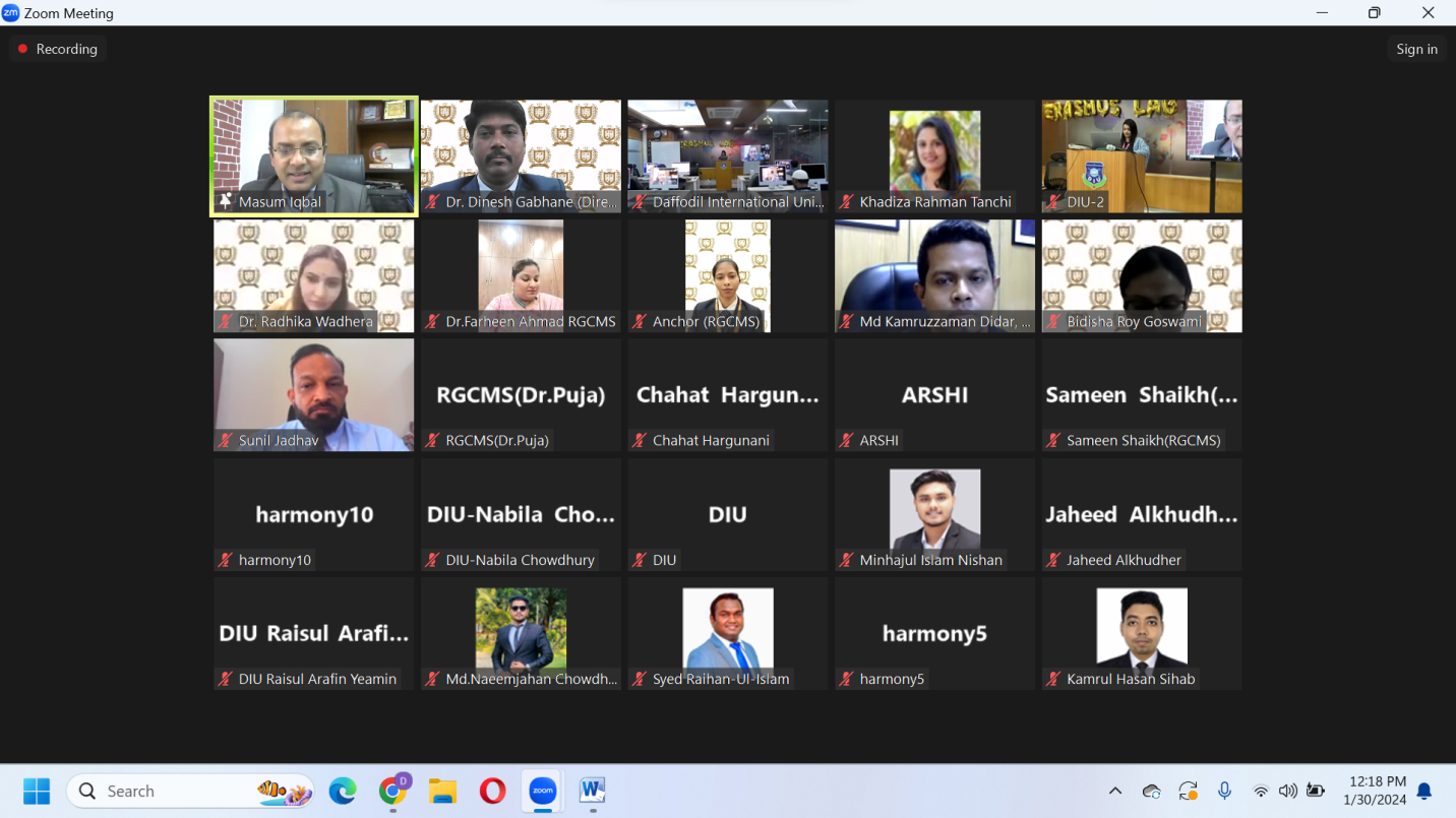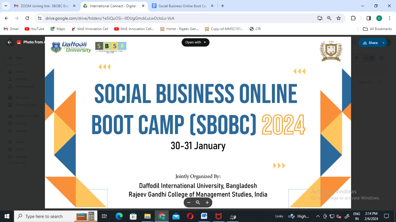 - Social Business Online Boot Camp (SBOBC) 2024, the online boot camp was jointly organized by the Daffodil International University, Bangladesh and Rajeev Gandhi College of Management Studies (RGCMS), Ghansoli (Navi Mumbai). The Joint Program was conducted for 2 days, 30-31 January 2024.